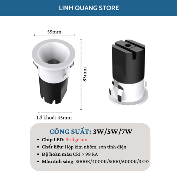 Đèn LED âm trần Spotlight SM13 Viền trắng chóa trắng, chống chói cao cấp, lỗ khoét 45mm - Cái